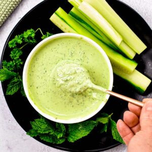 - Blend the tahini, cilantro, oranges, cayenne and salt together in a blender.