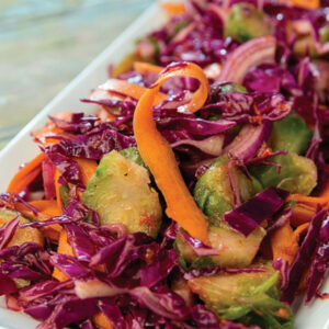 - En un tazón grande combine las coles de Bruselas, la cebolla morada, las zanahorias y la col rallada.
