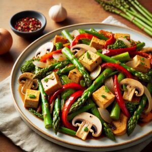 - Cortar el tofu y los champiñones en trozos pequeños. Picar el ajo. Cortar las cebolletas y los espárragos en trozos de 5 cm. Cortar la cebolla y el pimiento rojo en rodajas finas.