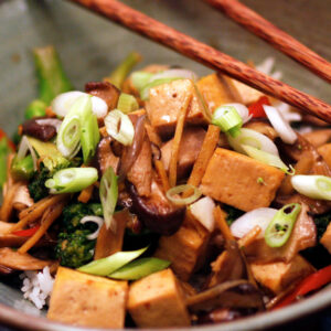 A delicious ginger stir fry that uses a wide variety of vegetables with tofu as the star. Yum!