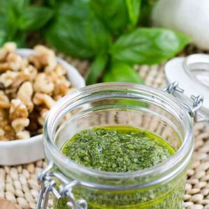 This pesto recipe comes together quick, can be adapted to use whatever green herbs you have on hand, and is packed with delicious protein from all the walnuts.