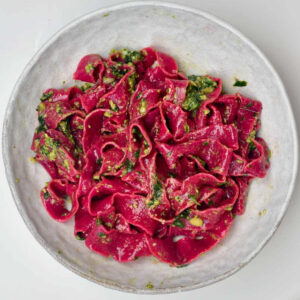 - Use beet juice or spinach to make red and green pasta. Puree the cooked beets or spinach very well in as little water as possible. The puree should make up 75% of the water added. Also reduce the amount of liquid to 5 fluid ounces with veg purees.